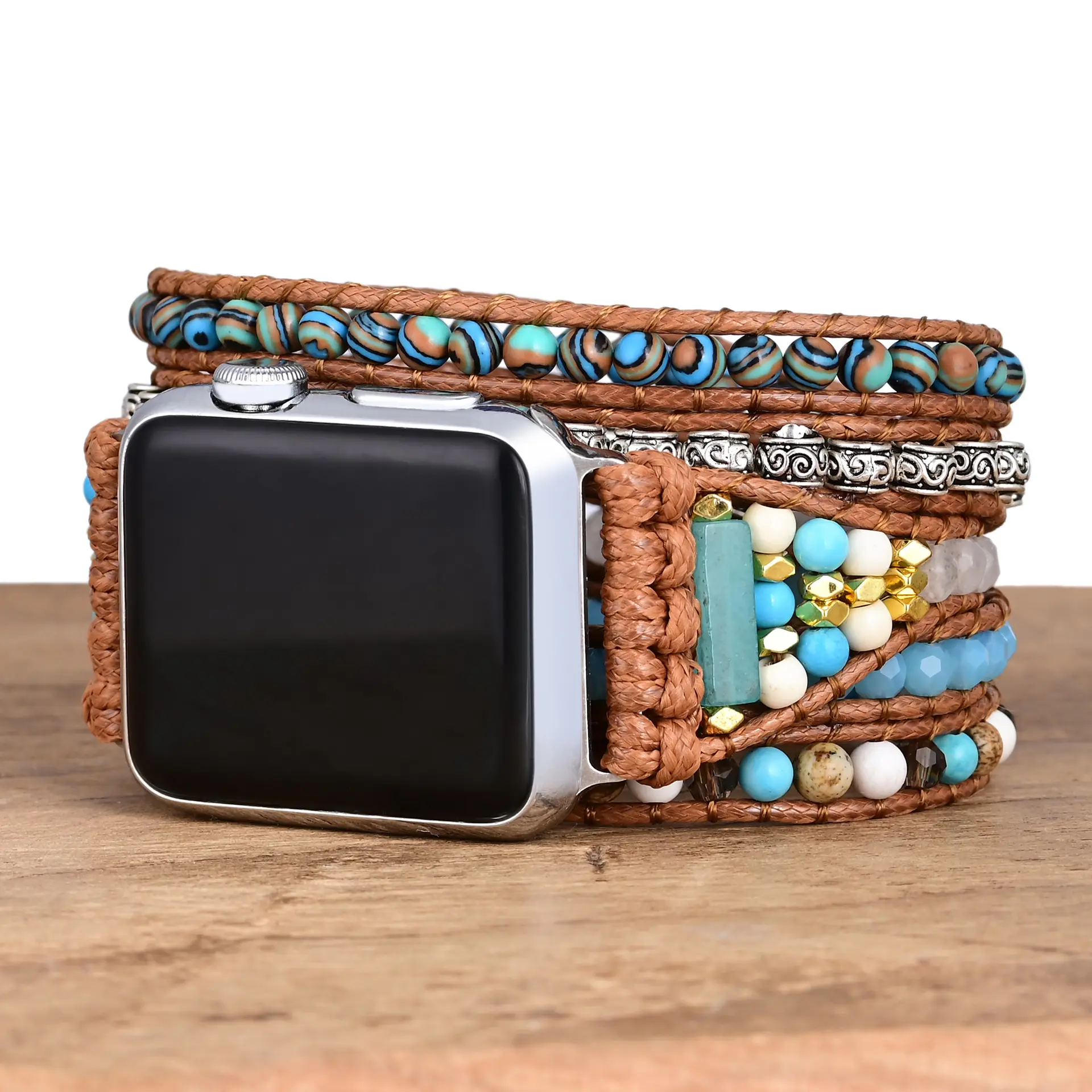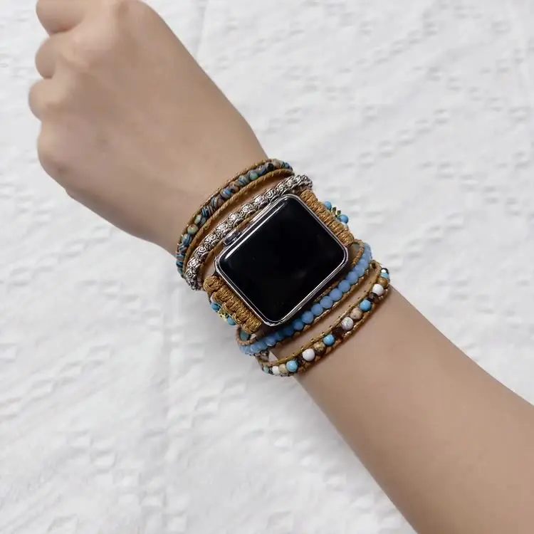Embrace the perfect fusion of natural elegance and spiritual symbolism with this Handwoven 5-Layer Natural Stone and Crystal Wrap Apple Watch Band. Crafted with care and passion, this multi-layered band combines the healing properties of genuine stones and crystals with the free-spirited Bohemian aesthetic, making it an exceptional accessory for your Apple Watch.